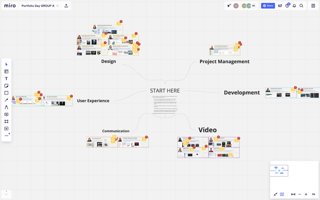 Last year, the Digital Corps held our annual Portfolio Day event online with both Zoom and Miro board elements. We divided the students between two Miro boards where they added their portfolio materials—their résumés, business cards, sample work, and websites—and a Zoom link, so students, staff, and alumni could network.