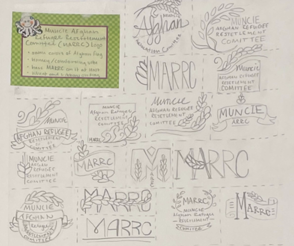 Last semester, the Corps created a website for the Muncie Afghan Refugee Resettlement Committee (MARRC), an organization committed to supporting and providing donations for local Afghan refugees. Clark was tasked with designing the logo. This was a great opportunity for her to showcase her design skills for a fast-paced project and an important cause. She says she went through about 30 to 40 sketches before landing on the final logo design. Logo designs go through many iterations, but Clark enjoys the process because it helps exercise her creativity.